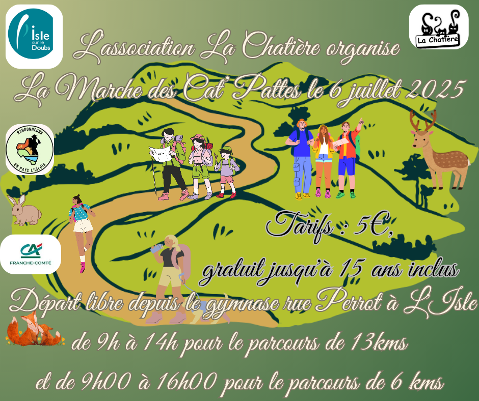 L'association La Chatière de L'Isle-sur-le-Doubs vous invite à sa 1ère marche. Venez marcher en faveur des chats errants et profitez de l'air de la campagne au milieu d'une Nature généreuse.
